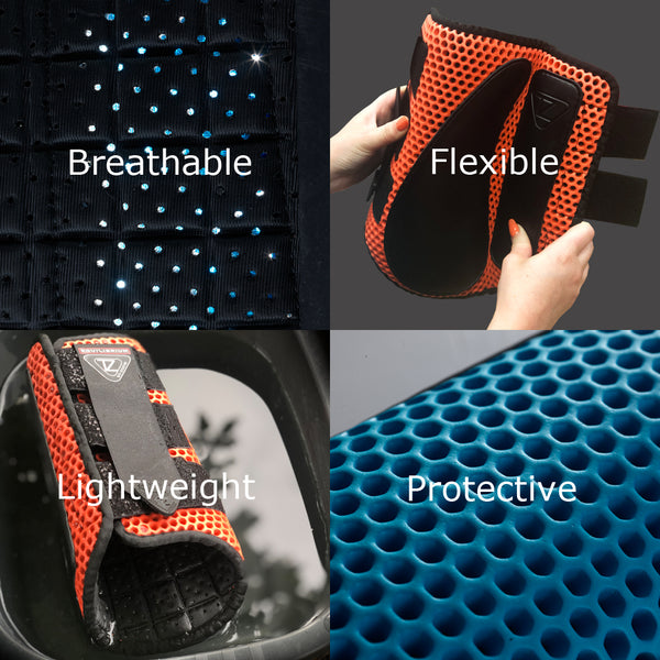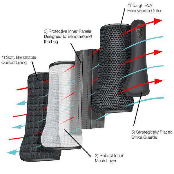 - Breathable Multi-Layer composition, with robust mesh inner layer, protective inner panels, tough EVA honeycomb outer, and strategically placed strike guards