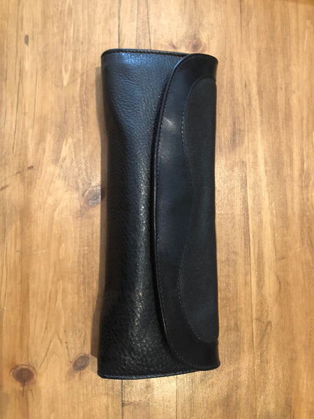 This elegant little handheld clutch purse is the perfect little companion to carry your essentials for the day. Whether you're taking a walk or going to an event, this clutch replaces a cumbersome and unnecessary large purse. It is made in Canada using top grain pebbled leather and trimmed in glazed black leather, has an inside open pocket for those ever so important business cards or lipstick. The clutch can accommodate a small or large mobile device, a compact, mascara and those necessary items you'll need for the day.